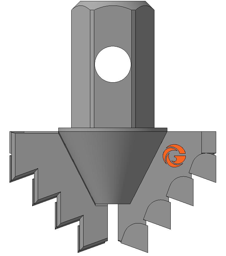 Ступенчатая форма режущей кромки долота под углом 70⁰, обеспечивает устойчивое разрушение забоя скважины в виде крупных кусков горной породы наличия дополнительных плоскостей обнажения, что обеспечивает высокую скорость бурения и быстрое удаление разрушенной породы с забоя.